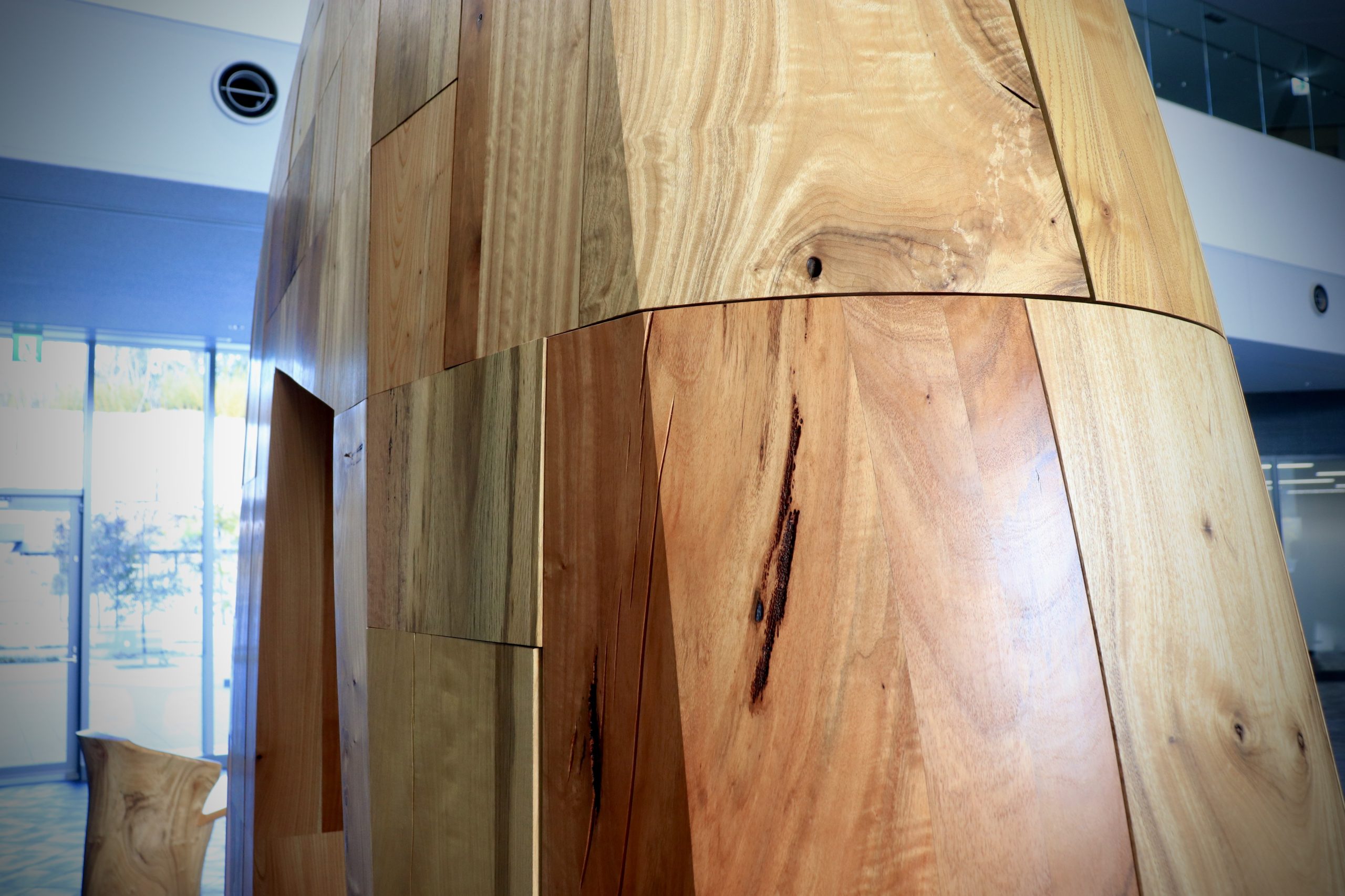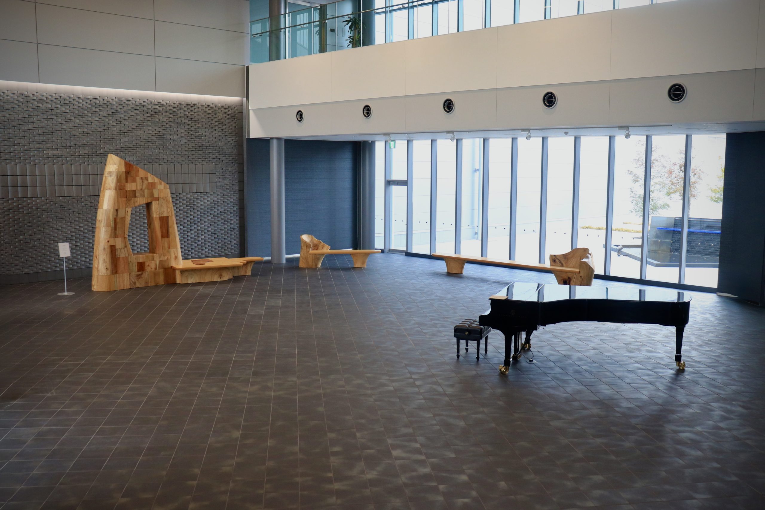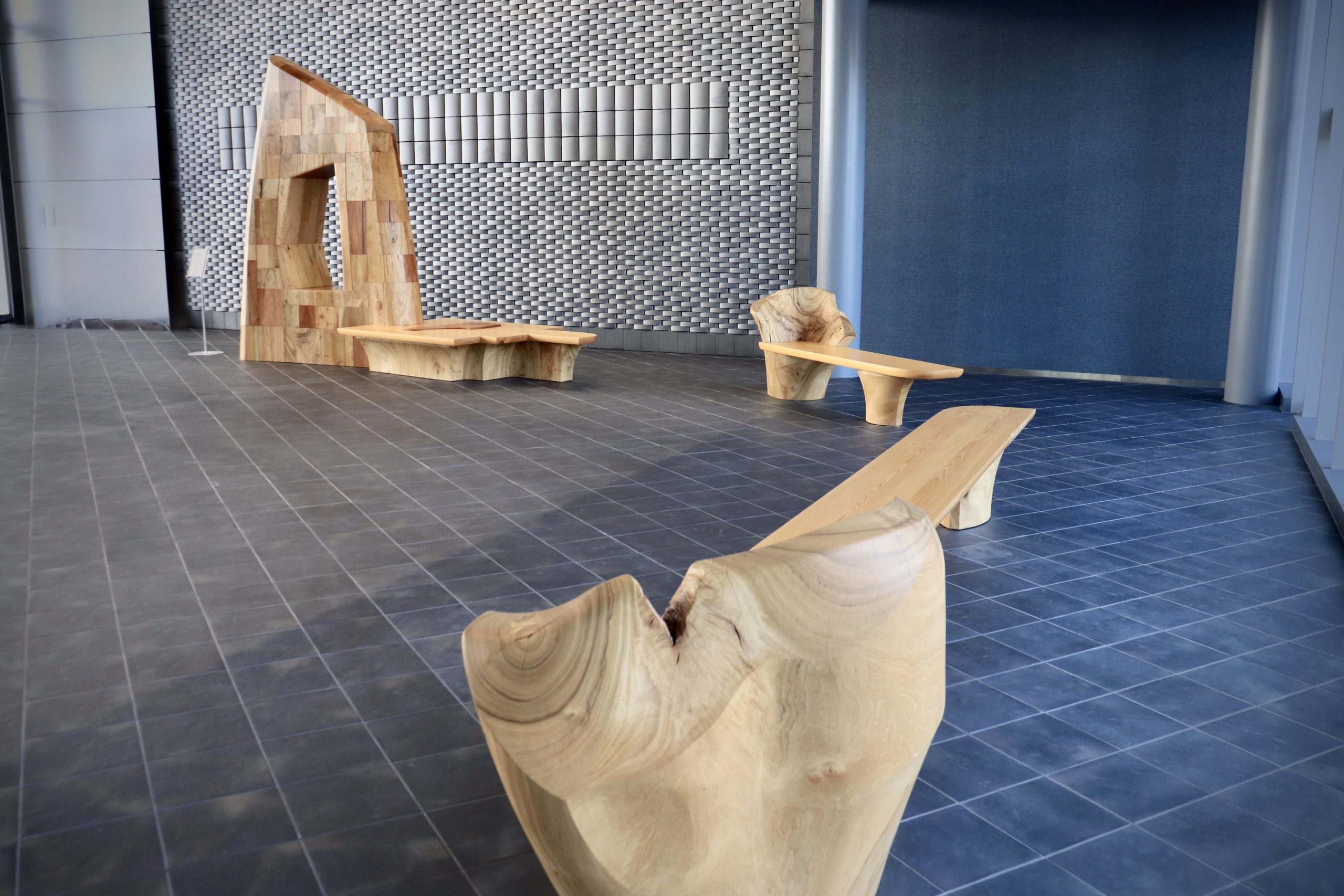 エントランスホールに入り第一印象は、積み上げたそれぞれの木のブロックがその個性を主張し始めたと感じた、しかしそうであるのに引いて全体を見ると塊としての一体感は設置当初よりも増して結束が強くなったとも感じた、それでいい