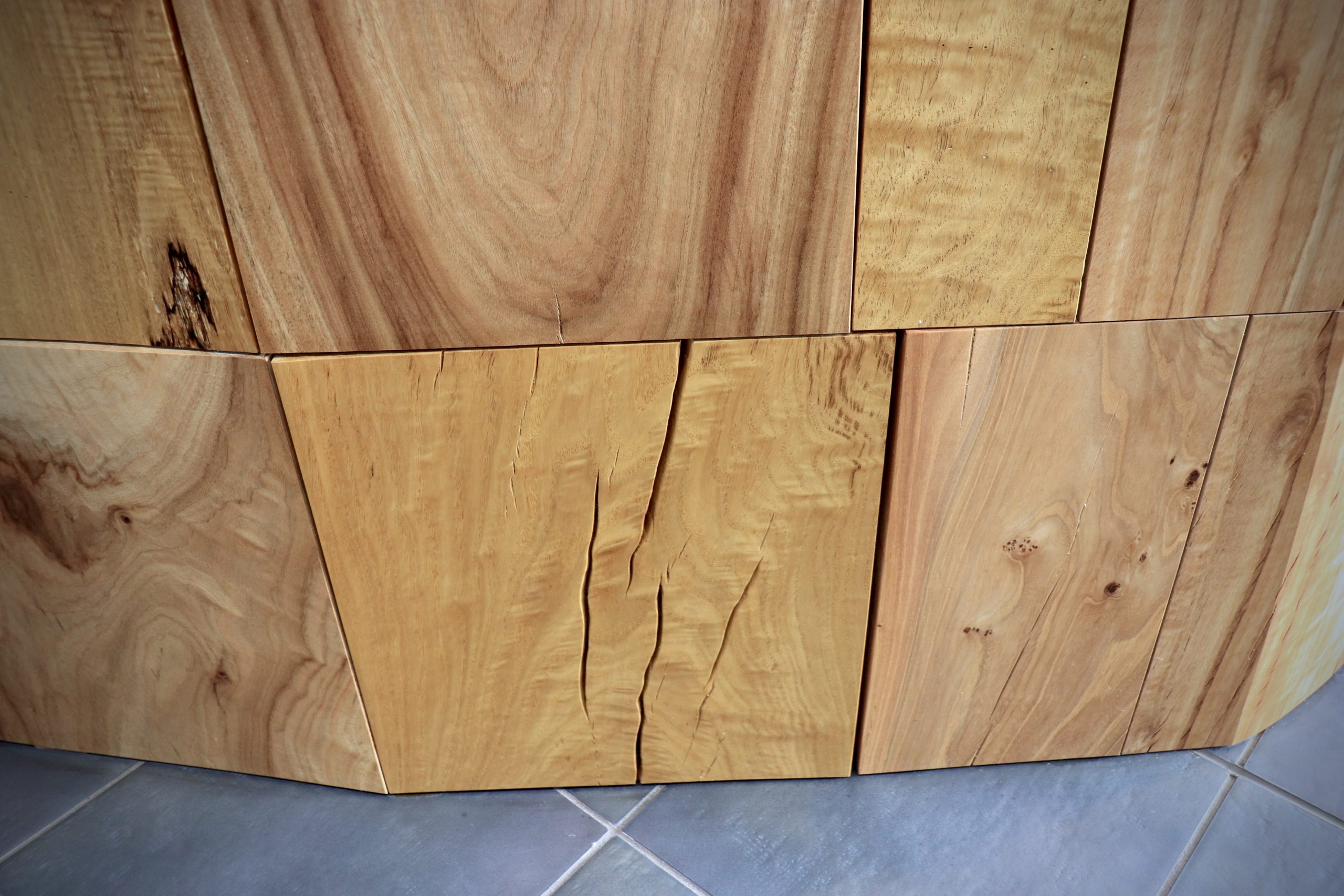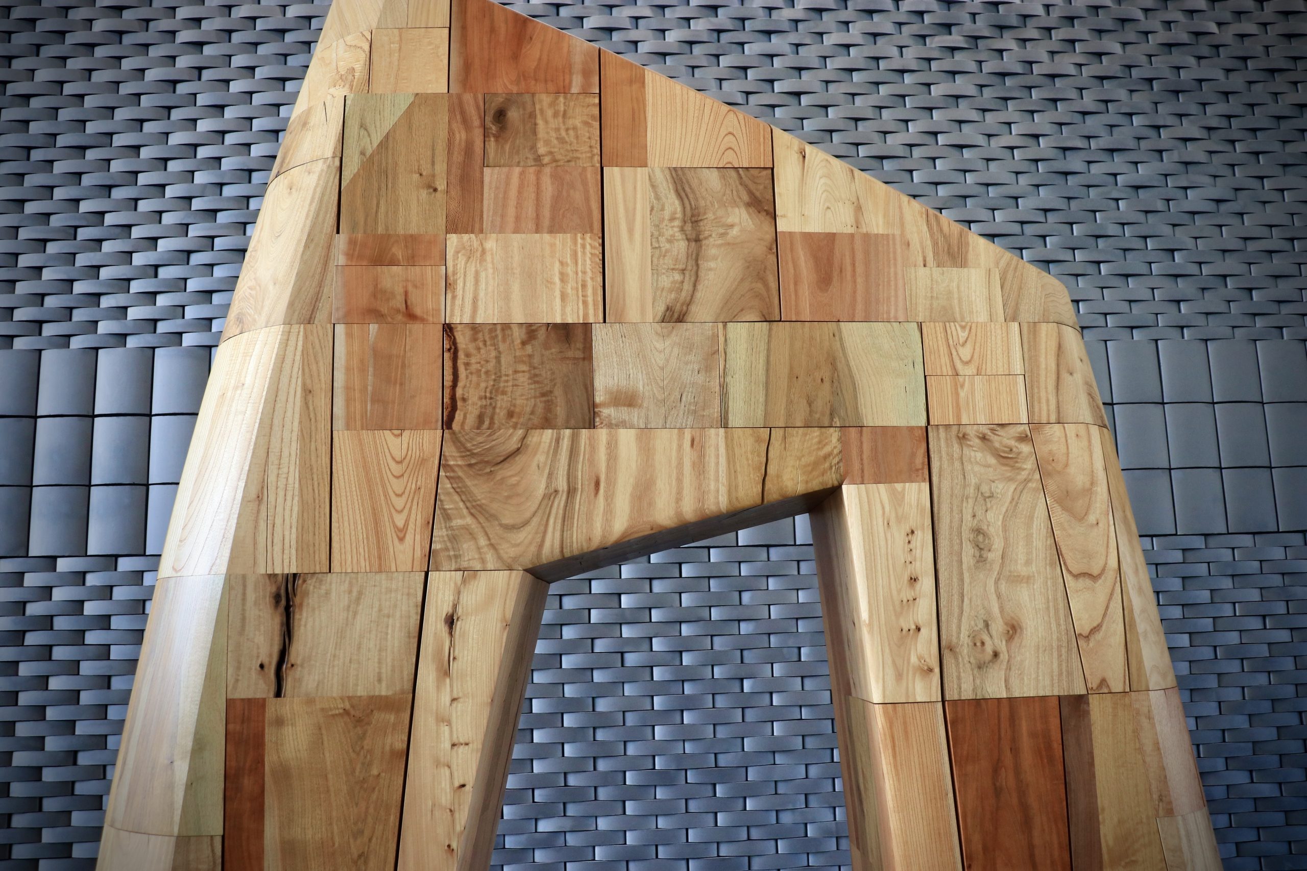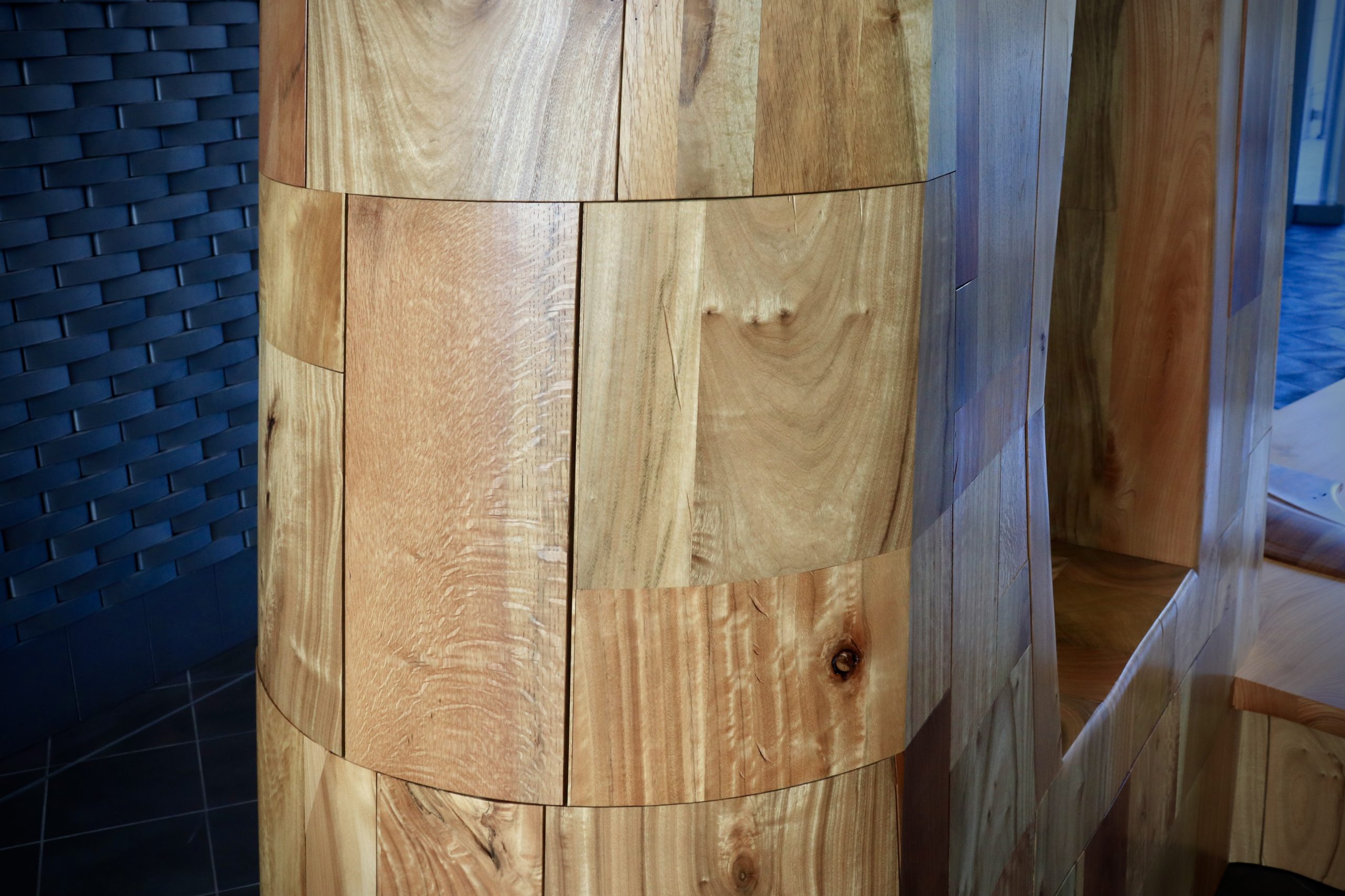 エントランスホールに入り第一印象は、積み上げたそれぞれの木のブロックがその個性を主張し始めたと感じた、しかしそうであるのに引いて全体を見ると塊としての一体感は設置当初よりも増して結束が強くなったとも感じた、それでいい